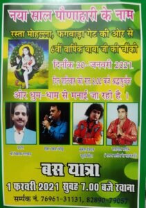 आज स्थानीय रस्ता मोहल्ला स्थित “नया साल पौणाहारी के नाम” संस्था द्वारा करवाये जा रहे सिद्ध बााबा बालक नाथ जी की 6वीं वार्षिक चौंकी जो की दिनांक 30 जनवरी2021 दिन शनिवार को रात 8 बजे बड़ी श्रद्धापूर्वक और धूम धाम से मनाई जा रही है उसका निमंत्रण पत्र वार्ड नं.51 से वरिष्ठ कांग्रेस नेता एवं पार्षद पति अनूप पाठक एवं