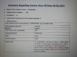 ब्यूरो:- ज़िला जालंधर में करोना के मामले लगातार बढ़ते जा रहे है। यह थमने का नाम नहीं ले रहे आज अयी रिपोर्ट में ज़िला जालंधर में 43 नए मामले सामने आए। जो कि गहरी चिंता की तरफ इशारा करते हैं। पंजाब रिफलेक्शन टीम सभी से अनुरोध करती है कि समाजिक दुरी बनाए रखे तथा बार बार हाथ धोते रहे।