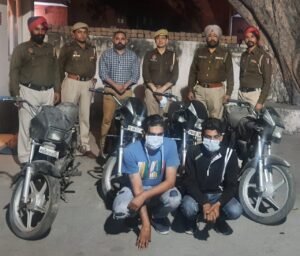 ਮਾਨਯੋਗ ਕਮਿਸ਼ਨਰ ਪੁਲਿਸ ਜਲੰਧਰ ਸ੍ਰੀ ਗੁਰਪ੍ਰੀਤ ਸਿੰਘ ਭੁੱਲਰ IPS ਜੀ ਦੇ ਦਿਸ਼ਾ ਨਿਰਦੇਸ਼ਾਂ ਅਨੁਸਾਰ ਸ਼ੁਰੂ ਕੀਤੀ ਗਈ ਐਂਟੀ ਸਨੈਚਿੰਗ ਅਤੇ ਐਂਟੀ ਥੇਫਟ ਮੋਹਿਮ ਨੂੰ ਉਦੋਂ ਬੜੀ ਸਫਲਤਾ ਹਾਸਲ ਹੋਈ ਜਦੇ ਏ ਡੀ ਸੀ ਪੀ ਸਿਟੀ -1 ਸ੍ਰੀ ਮਤੀ ਵਤਸਲਿਆ ਗੁਪਤਾ ਦੀ ਨਿਗਰਾਨੀ ਹੇਠ ਹਰਸਿਮਰਤ ਸਿੰਘ ਏ ਸੀ ਪੀ ਸੈੱਲ ਦੀ ਹਦਾਇਤ ਮੁਤਾਬਿਕ ਮੁੱਖ ਅਫਸਰ ਥਾਣਾ ਨਵੀਂ ਬਾਰਾਦਰੀ ਇੰਸਪੈਕਟਰ ਰਵਿੰਦਰ ਕੁਮਾਰ ਦੀ ਪੁਲਿਸ ਪਾਰਟੀ ਵਿੱਚ ਮਿਤੀ 03.03.2021 ਨੂੰ s1 ਹਰਦੇਵ ਸਿੰਘ ਸਮੇਤ ਸਾਥੀ ਕਰਮਚਾਰੀਆਂ ਦੇ ਬਾਏ ਤਲਾਸ਼ ਸ਼ੱਕੀ ਪੁਰਸ਼ਾਂ ਨਾਕਾ ਕ੍ਰਿਸ਼ਨਾ ਫੈਕਟਰੀ ਲਾਡੋਵਾਲੀ ਰੋਡ ਜਲੰਧਰ ਮੌਜੂਦ ਸੀ ਕਿ ਇਕ ਮੋਟਰਸਾਈਕਲ ਤੇ ਦੋ ਨੌਜਵਾਨ ਜੋ ਕਿ BSF ਚੌਕ ਵੱਲ ਆ ਰਹੇ ਸੀ । ਜੋ ਪੁਲਿਸ ਦੀ ਨਾਕਾ ਬੰਦੀ ਦੇਖ ਕੇ ਇੱਕ ਦੱਮ ਡਿਵਾਈਡਰ ਤੋਂ ਪਿੱਛੇ ਨੂੰ ਮੁੜਨ ਲੱਗੇ ਤਾਂ ਮੋਟਰ ਸਾਈਕਲ ਸਲਿੱਪ ਹੋਣ ਕਾਰਨ ਡਿੱਗ ਪਏ ਨੂੰ S1 ਨੇ ਸਾਥੀ ਕਰਮਚਾਰੀਆਂ ਦੀ ਮਦਦ ਨਾਲ ਸ਼ੱਕ ਦੀ ਬਿਨਾਅ ਤੇ ਰੋਕ ਕੇ ਨਾਮ ਪਤਾ ਪੁੱਛਿਆ ਜੋ ਮੋਟਰ ਸਾਈਕਲ ਚਾਲਕ ਨੇ ਆਪਣਾ ਨਾਮ ਨਵਜੋਤ ਕੁਮਾਰ ਉਰਫ ਜੋਤ ਪੁੱਤਰ ਲੇਟ ਸੁਰਿੰਦਰਪਾਲ ਵਾਸੀ ਕਿਰਾਏਦਾਰ ਮਕਾਨ ਨੰਬਰ 109 , ਗਲੀ ਨੰਬਰ 13 , ਮੁਹੱਲਾ ਟੈਗੋਰ ਨਗਰ , ਥਾਣਾ ਡਵੀਜ਼ਨ ਨੰਬਰ 2 , ਜਲੰਧਰ ਅਤੇ ਪਿਛੇ ਬੈਠੇ ਨੌਜਵਾਨ ਨੇ ਆਪਣਾ ਨਾਮ ਨਵਦੀਪ ਸਿੰਘ ਉਰਫ ਗੱਗੂ ਉਰਫ ਮਨੀ ਪੁੱਤਰ ਲੇਟ ਰਛਪਾਲ ਸਿੰਘ ਵਾਸੀ ਮਕਾਨ ਨੰਬਰ 317 ਜਗਜੀਤ ਕਲੋਨੀ , ਦਕੋਹਾ , ਥਾਣਾ ਰਾਮਾਮੰਡੀ ਜਲੰਧਰ ਦੱਸਿਆ ਜਿਹਨਾ ਪਾਸੋਂ ਉਹਨਾ ਦੇ ਮੋਟਰ ਸਾਈਕਲ ਦੇ ਦਸਤਾਵੇਜਾਂ ਦੀ ਮੰਗ ਕੀਤੀ ਗਈ ਪਰ ਉਹ ਕੋਈ ਵੀ ਦਸਤਾਵੇਜ ਨਹੀਂ ਦਿਖਾ ਸਕੇ । ਜਿਸ ਤੇ S1 ਦੁਆਰਾ ਮੋਟਰ ਸਾਈਕਲ ਤੇ ਲੱਗੀਆਂ ਨੰਬਰ ਪਲੇਟਾਂ ਤੇ ਲਿਖੇ ਨੰਬਰ PB – 08 – CK – 6906 ਬਾਰੇ ਥਾਣੇ ਦੇ ਕੰਪਿਉਟਰ ਕਲਰਕ ਰੱਹੀ ਥਾਣੇ ਦੇ ਕੰਪਿਊਟਰ ਵਿਚ ਲੋਡ ਐਪ ਤੋਂ ਉਕਤ ਨੰਬਰ ਬਾਰੇ ਡਿਟੇਲ ਦੇਣ ਨੂੰ ਕਿਹਾ ਜਿਸ ਤੇ ਇਹ ਮੋਟਰ ਸਾਈਕਲ ਤੇ ਲੱਗਾ ਨੰਬਰ ਇਕ ਸਫਾਰੀ ਗੱਡੀ ਦਾ ਹੋਣਾ ਪਾਇਆ ਜਾਣ ਤੇ ਜਿਸਤੇ SI ਦੁਅਰਾ ਕਾਬੂ ਸੁਦਾ ਨੌਜਵਾਨਾਂ ਪਾਸੋਂ ਸਖਤੀ ਨਾਲ ਪੁੱਛਗਿੱਛ ਕਰਨ ਤੇ ਉਹਨਾ ਨੇ ਦੱਸਿਆ ਕਿ ਇਹ ਮੋਟਰ ਸਾਈਕਲ ਉਹਨਾ ਨੇ ਕਰੀਬ 475 ਮਹੀਨੇ ਪਹਿਲਾਂ ਡੇਰਾ ਬਾਬਾ ਮੁਰਾਦ ਸ਼ਾਹ ਨਕੋਦਰ ਤੋਂ ਚੋਰੀ ਕੀਤਾ ਸੀ।ਜਿਸਤੇ SI ਨੇ ਦੋਹਾਂ ਨੌਜਵਾਨਾਂ ਦੇ ਖਿਲਾਫ ਮੁੱਕਦਮਾ ਨੰਬਰ ਮੁਕੱਦਮਾ ਨੰ . ੪ ਮਿਤੀ 03.03.2021 ਅ / ਧ 379 , 411 , 482 , 34 IPC ਥਾਣਾ ਨਵੀਂ ਬਾਰਾਦਰੀ ਜਲੰਧਰ ਦਰਜ ਰਜਿਸਟਰ ਕੀਤਾ ਗਿਆ ਦੋਰਾਨੇ ਪੁਛਗਿਛ ਮੁੱਕਦਮਾ ਵਿੱਚ ਹੇਠ ਲਿਖੇ ਚੋਰੀ ਕੀਤੇ ਹੋਏ ਮੋਟਰਸਾਈਕਲ ਨਿਸ਼ਾਨਦੇਹੀ ਕਰਵਾਕੇ ਬਾਮਦ ਕਰਵਾਏ ਬਾਮਦਾ ਮੋਟਰਸਾਈਕਲ 1 ) ਇੱਕ ਮੋਟਰਸਾਈਕਲ ਸਪਲੈਂਡਰ ਪਰੋ ਰੰਗ ਕਾਲਾ ਕਰੀਬ ਡੇਢ ਸਾਲ ਪਹਿਲਾਂ ਪਿਮਸ ਹਸਪਤਾਲ ਦੀ ਪਾਰਕਿੰਗ ਵਿੱਚੋਂ ਚੋਰੀ ਕੀਤਾ ਮੰਨੀਆ ਜਿਹਨਾ ਨੇ ਨੰਬਰ ਪਲੇਟ ਬਦਲਕੇ ਫਰਜੀ ਨੰਬਰ PB08DM 2197 ਲਿਖਿਆ ਹੋਇਆ ਸੀ 2 ) ਇੱਕ ਮੋਟਰਸਾਈਕਲ ਸਪਲੈਂਡਰ ਪਲੱਸ ਰੰਗ ਨੀਲਾ ਜੋ ਅਲੀ ਮੁੱਹਲੇ ਤੋਂ ਚੋਰੀ ਕੀਤਾ ਸੀ ਜਿਸ ਪਰ ਫਰਜੀ ਨੰਬਰ PB 08 – Dx 8054 ਲਾਇਆ ਸੀ । 3 ) ਇੱਕ ਮੋਟਰਸਾਈਕਲ ਸਪਲੈਂਡਰ ਪਲਸ ਨੰਬਰੀ ਪੀ ਬੀ 10 ਈ ਯੂ 5075 ਜੋ ਦੋਸ਼ੀਆ ਨੇ ਫਗਵਾੜਾ ਤੋਂ ਚੋਰੀ ਕੀਤਾ ਸੀ ਬਾਮਦ ਕਰਵਾਏ ਹਨ ਜਿਹਨਾ ਪਾਸੋ ਹੋਰ ਤਫਤੀਸ਼ ਪੁਛਗਿਛ ਦੋਰਾਨੇ ਤਫਤੀਸ਼ ਪਾਇਆ ਗਿਆ ਹੈ ਕਿ ਦੋਸ਼ੀ ਨਵਦੀਪ ਸਿੰਘ ਮੋਟਰਸਾਈਕਲ ਮਕੈਨਿਕ ਹੈ ਅਤੇ ਦੂਜਾ ਦੋਸ਼ੀ ਨਵਜੋਤ ਕੁਮਾਰ ਏਅਰ ਟੈਲ ਕੰਪਨੀ ਵਿੱਚ ਨੌਕਰੀ ਕਰਦਾ ਹੈ ਅਤੇ ਇਹ ਦੋਵੇਂ ਦੋਸ਼ੀ ਮੋਟਰਸਾਈਕਲ ਚੋਰੀ ਕਰਕੇ ਜਾਅਲੀ ਨੰਬਰ ਲਗਾਕੇ ਆਪਣੇ ਨਿੱਜੀ ਵਰਤੋਂ ਲਈ ਚਲਾ
