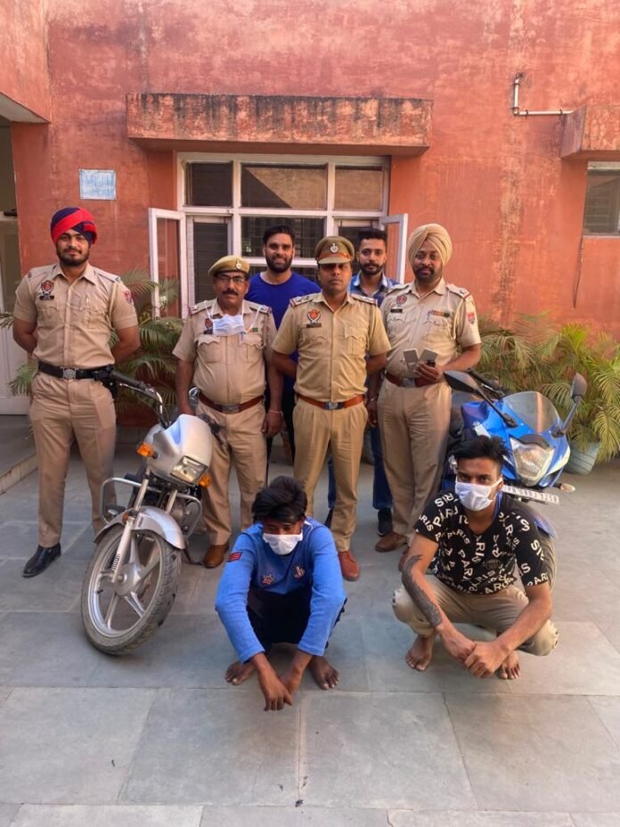 डिवीज़न न.5 से ऐ एस आई मोहन लाल को विनोद कुमार निवासी उजाला नगर ने सूचना दी कि वह 30 मार्च को सुबह 4.15 बजे अपने काम से घर वापिस जा रहा था तो उसको चार व्यक्तिओ ने बाबू जगजीवन राम गेट से थोडा पीछे रोक कर उस के साथ मार कुटाई करके उसका मोटरसाइकिल और उसका फ़ोन ले कर फरार हो गए है। जिस पर उसका बयान लिख कर उसपर कार्यवाही करते हुए दोषी सुखजिंदर सिंह,मनप्रीत सिंह को गिरफ्तार किया गया और इनके पास से मोटरसाइकिल नंबर PB08 DJ 1258 सुजकी नीला कलर और मोबाइल फ़ोन बरामद किया गया।उक्त दोषियो को अदालत में पेश करके 3 दिन का पुलिस रिमांड ले लिया गया है।
