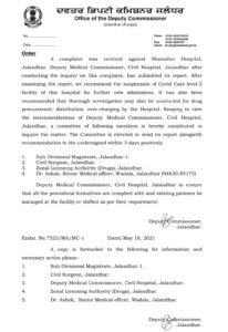 ਸ਼ਮਸ਼ੇਰ ਹਸਪਤਾਲ ਦੇ ਖਿਲਾਫ ਮਿਲੀ ਸ਼ਿਕਾਇਤ, ਜਲੰਧਰ ਸੀ. ਇਸ ਸ਼ਿਕਾਇਤ ‘ਤੇ ਜਾਂਚ ਕਰਨ ਉਪਰੰਤ ਡਿਪਟੀ ਮੈਡੀਕਲ ਕਮਿਸ਼ਨਰ, ਸਿਵਲ ਹਸਪਤਾਲ, ਜਲੰਧਰ ਨੇ ਆਪਣੀ ਰਿਪੋਰਟ ਸੌਂਪ ਦਿੱਤੀ ਹੈ। ਰਿਪੋਰਟ ਦੀ ਪੜਤਾਲ ਕਰਨ ਤੋਂ ਬਾਅਦ, ਅਸੀਂ ਇਸ ਹਸਪਤਾਲ ਦੀ ਕੋਵਿਡ ਕੇਅਰ ਲੈਵਲ -2 ਸਹੂਲਤ ਨੂੰ ਹੋਰ ਨਵੇਂ ਦਾਖਲਿਆਂ ਲਈ ਮੁਅੱਤਲ ਕਰਨ ਦੀ ਸਿਫਾਰਸ਼ ਕਰਦੇ ਹਾਂ. ਇਹ ਸਿਫਾਰਸ਼ ਵੀ ਕੀਤੀ ਗਈ ਹੈ ਕਿ ਹਸਪਤਾਲ ਵੱਲੋਂ ਨਸ਼ਿਆਂ ਦੀ ਖਰੀਦ, ਵੰਡ ਅਤੇ ਓਵਰ ਚਾਰਜਿੰਗ ਦੀ ਵੀ ਪੂਰੀ ਜਾਂਚ ਕੀਤੀ ਜਾ ਸਕਦੀ ਹੈ। ਡਿਪਟੀ ਮੈਡੀਕਲ ਕਮਿਸ਼ਨਰ, ਸਿਵਲ ਹਸਪਤਾਲ, ਜਲੰਧਰ ਦੀਆਂ ਸਿਫਾਰਸ਼ਾਂ ਨੂੰ ਧਿਆਨ ਵਿਚ ਰੱਖਦਿਆਂ, ਇਸ ਮਾਮਲੇ ਦੀ ਜਾਂਚ ਲਈ ਹੇਠ ਦਿੱਤੇ ਮੈਂਬਰਾਂ ਦੀ ਕਮੇਟੀ ਬਣਾਈ ਗਈ ਹੈ। ਕਮੇਟੀ ਨੂੰ ਹਦਾਇਤ ਕੀਤੀ ਗਈ ਹੈ ਕਿ ਸਿਫਾਰਸ਼ ਦੇ ਨਾਲ ਆਪਣੀ ਰਿਪੋਰਟ 3 ਦਿਨਾਂ ਦੇ ਅੰਦਰ ਅੰਦਰ ਹੇਠਾਂ ਭੇਜ ਦਿੱਤੀ ਜਾਵੇ।