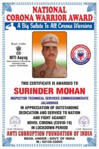 रिफ्लेक्शन ब्यूरो:- (नीतू ) एंटी करप्शन फाउंडेशन ऑफ इंडिया (भारत सरकार द्वारा मान्यता प्राप्त) की तरफ से जिला जालंधर में कोरोना वॉरियर्स को सम्मानित किया गया ।