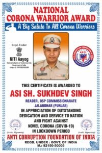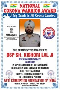 रिफ्लेक्शन ब्यूरो:- (नीतू ) एंटी करप्शन फाउंडेशन ऑफ इंडिया (भारत सरकार द्वारा मान्यता प्राप्त) की तरफ से जिला कपूरथला में कोरोना वॉरियर्स को सम्मानित किया गया । करोना काल के दौरान अपने जिले में बहुत बढ़िया ढंग से अपनी सेवाएं निभाने के लिए जिला कपूरथला के डी.एस.पी श्री किशोरी लाल जी, ए.एस.आई श्री सुखदेव सिंह ( रीडर डीएसपी कमिश्नरेट )तथा सुरेंद्र मोहन (इंस्पेक्टर टेक्निकल सर्विसेज कमिश्नरेट, जालंधर )जी को ए. सी. एफ़ .आई के स्टेट चीफ डायरेक्टर मनदीप सिंह ,स्टेट चीफ एडवाइजर गुरमेल सिंह गिल, स्टेट डिप्टी डायरेक्टर संजय जैन ,कपूरथला रूरल प्रेसिडेंट अवतार सिंह, डिस्ट्रिक्ट चेयरमैन जालंधर कुलविंदर सिंह मल्ली, डिस्ट्रिक्ट चेयर पर्सन जालंधर सुखविंदर कौर, यूथ डिप्टी डायरेक्टर प्रभजोत सिंह ,सिटी प्रेसिडेंट कपूरथला दीपक नागर जी के द्वारा इन्हें सम्मान चिन्ह देकर सम्मानित किया गया।