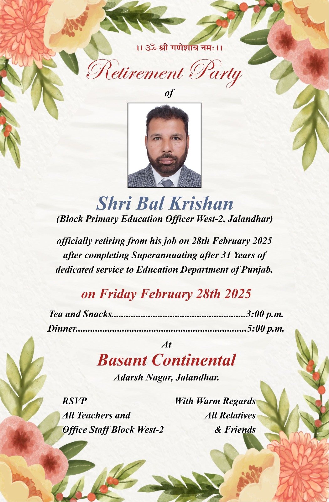 ਸ਼੍ਰੀ ਬਾਲ ਕ੍ਰਿਸ਼ਨ ਬਲਾਕ ਸਿੱਖਿਆ ਅਧਿਕਾਰੀ (B.P.E.O) ਵੈਸਟ -2 ਸਿੱਖਿਆ ਵਿਭਾਗ ਨੂੰ 31 ਸਾਲ ਆਪਣੀ ਸੇਵਾਵਾਂ ਦੇ ਕੇ ਹੋਏ ਰਿਟਾਇਰ