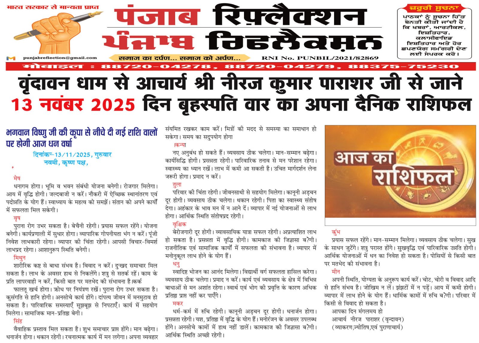 Breaking NewsNEWSPunjabदिनांक 13 नवंबर 2025 दिन बृहस्पति वार के राशिफल समेत मुख्य समाचारBy Admin - November 13, 202502 Share on Facebook Tweet on Twitter tweet दिनांक 13 नवंबर 2025 दिन बृहस्पति वार के राशिफल समेत मुख्य समाचार Google+ Google+ Google+ Post Views: 3