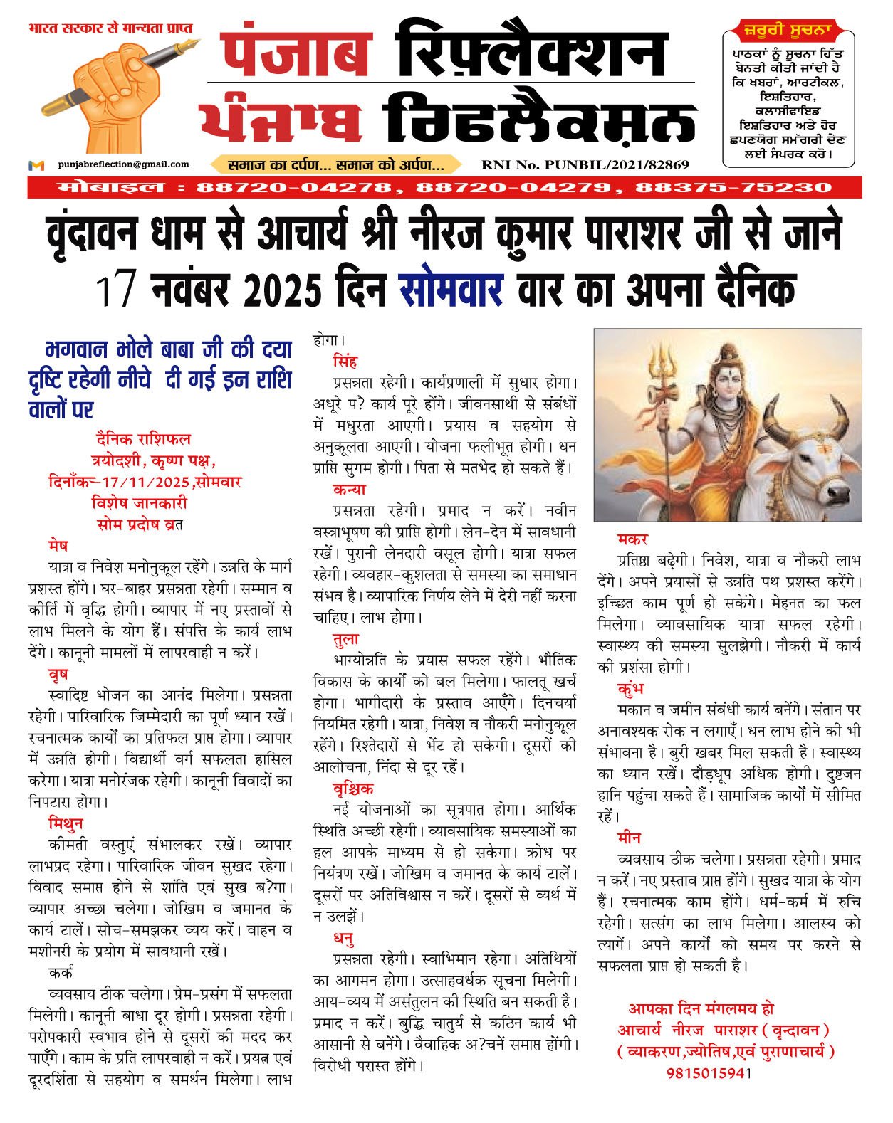 वृंदावन धाम से आचार्य श्री नीरज कुमार पाराशर जी से जाने 17 नवंबर 2025 दिन सोमवार का अपना दैनिक राशिफल