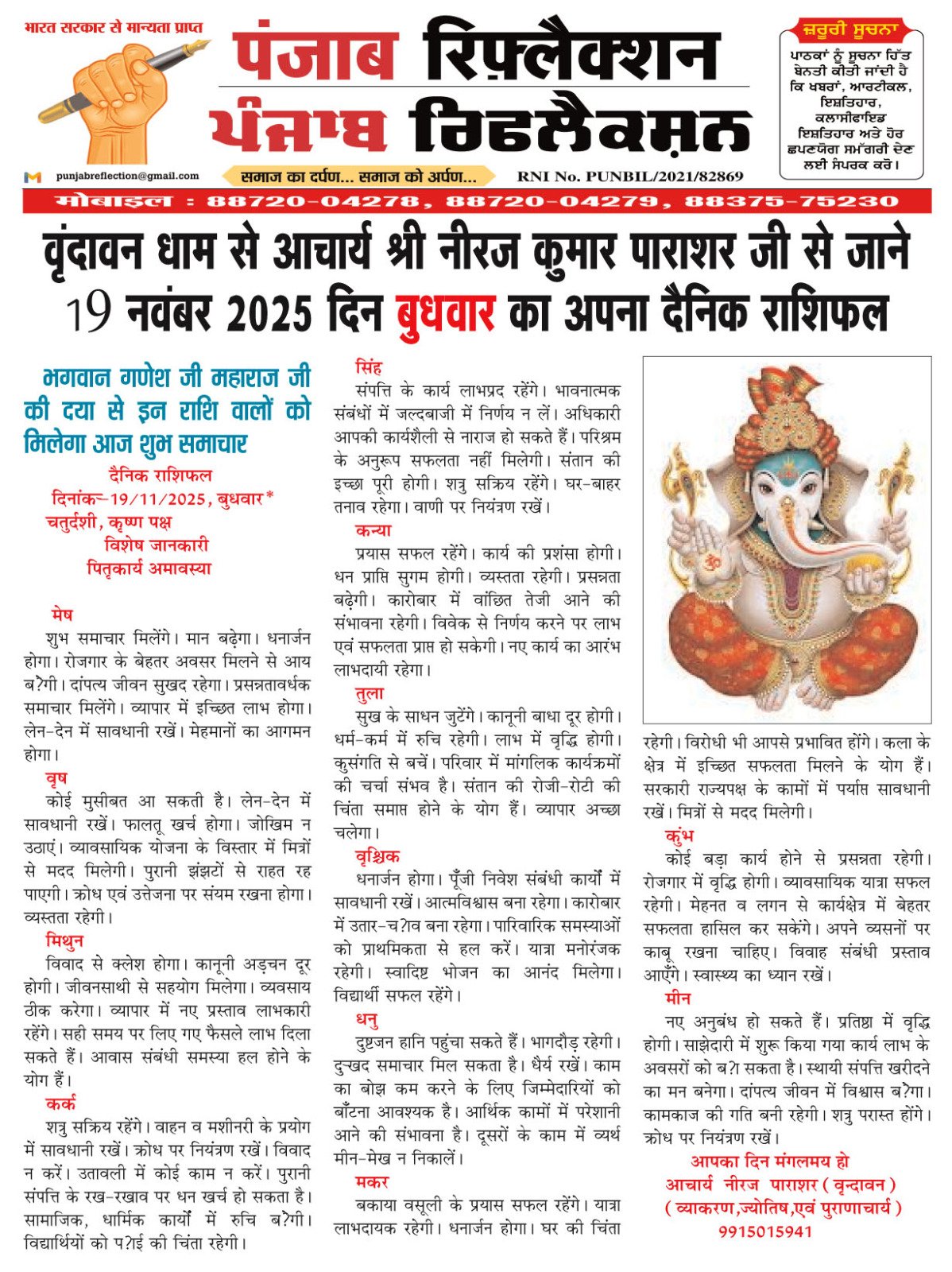 वृंदावन धाम से आचार्य श्री नीरज कुमार पाराशर जी से जाने 19 नवंबर 2025 दिन बुधवार का अपना दैनिक राशिफलदिनांक:-19/11/2025, बुधवार*