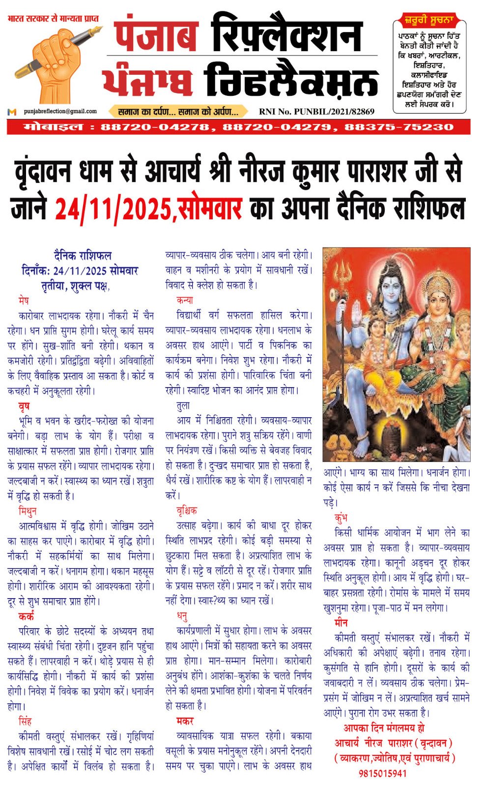 वृंदावन धाम से आचार्य श्री नीरज कुमार पाराशर जी से जाने 24 नवंबर 2025 दिन सोमवार का अपना दैनिक राशिफल