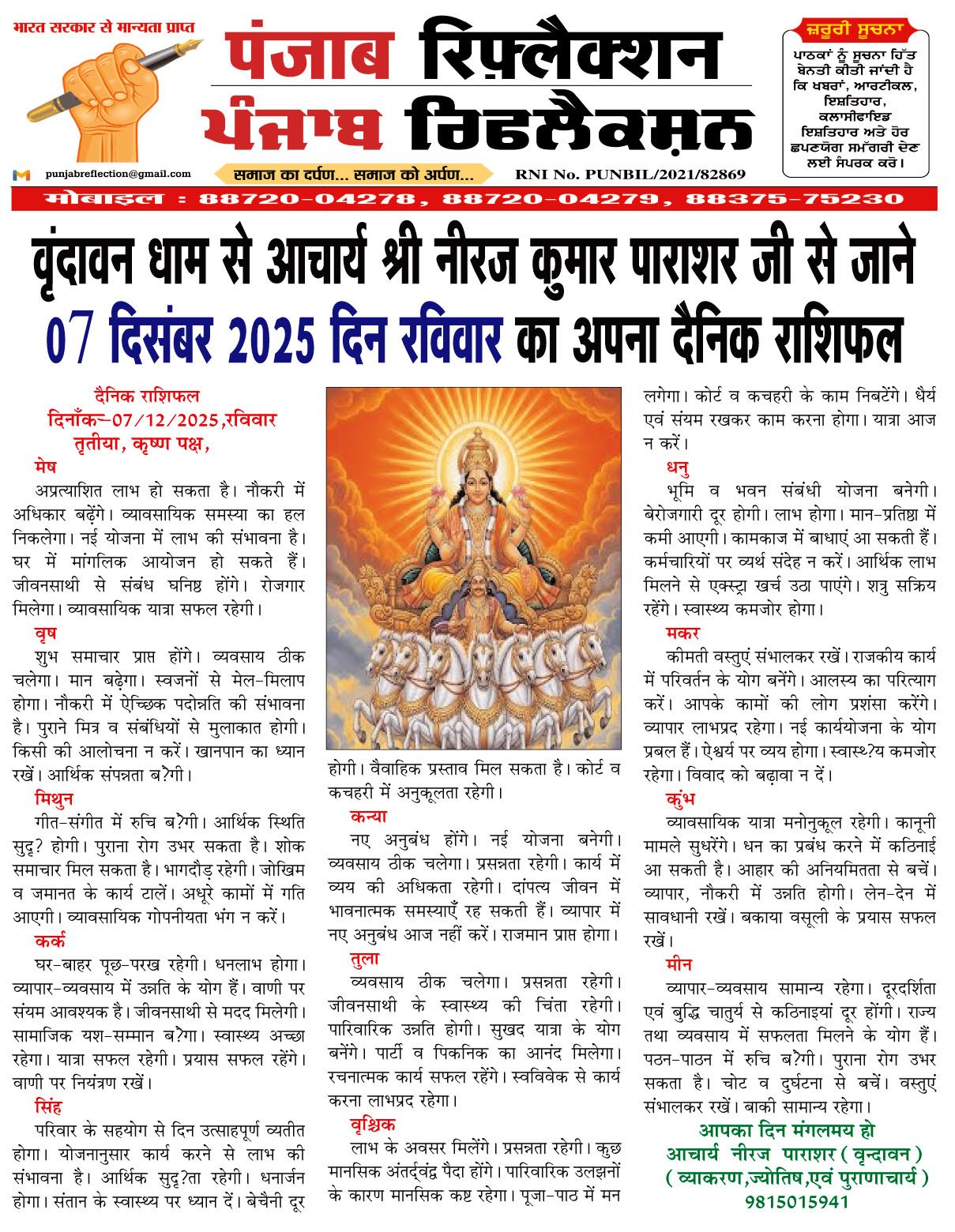पाराशर जी से जाने 07 दिसंबर 2025 दिन रविवार का अपना दैनिक राशिफल
