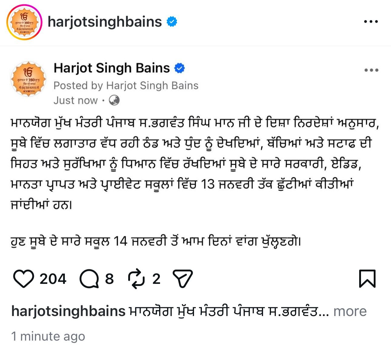 ਪੰਜਾਬ ਵਿੱਚ ਵਧ ਰਹੀ ਸਖ਼ਤ ਸਰਦੀ ਅਤੇ ਘਣੀ ਧੁੰਦ ਦੇ ਮੱਦੇਨਜ਼ਰ ਪੰਜਾਬ ਸਰਕਾਰ ਨੇ ਸੂਬੇ ਦੇ ਸਾਰੇ ਸਰਕਾਰੀ ਸਕੂਲਾਂ ਵਿੱਚ ਸਰਦੀ ਦੀਆਂ ਛੁੱਟੀਆਂ 13 ਜਨਵਰੀ ਤੱਕ ਵਧਾਉਣ ਦਾ ਫੈਸਲਾ ਕੀਤਾ ਹੈ।
