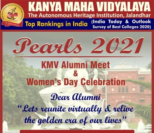ਕੇ.ਐਮ.ਵੀ. ਦੁਆਰਾ 8-3-2021 ਨੂੰ ਅੰਤਰਰਾਸ਼ਟਰੀ ਮਹਿਲਾ ਦਿਵਸ ਮੌਕੇ ਆਨਲਾਈਨ ਆਯੋਜਿਤ ਹੋਵੇਗੀ ਐਲੂਮਨਾਈ ਮੀਟ ਪਰਲਜ਼...